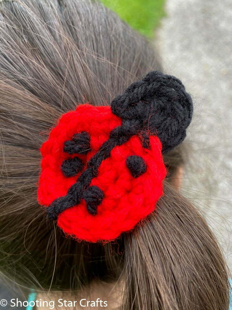 My daughter wears her hair in a ponytail every day for school. To make this more exciting she likes me to crochet different hair ties for her to wear. Since her classroom is ladybug themed, it was only fitting that we crochet a ladybug hair tie for her to wear.