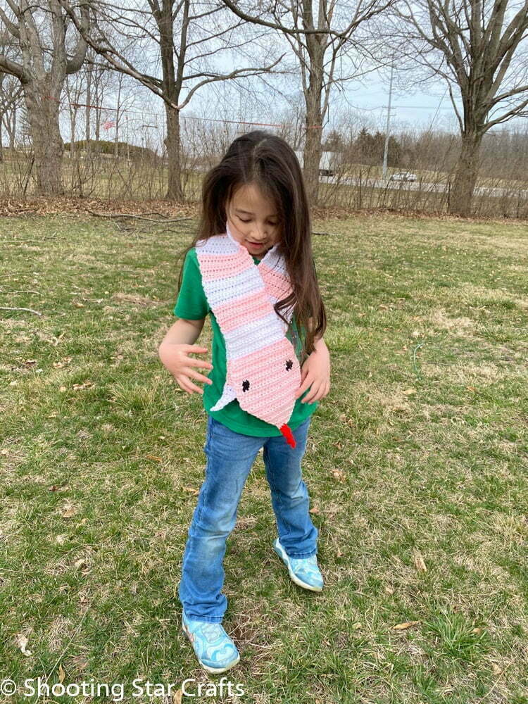 My daughter’s most recent request was for me to make a snake scarf for her to wear. I let her pick out the colors for her snake. She said it needed to be pink and white because those are two of her favorite colors.