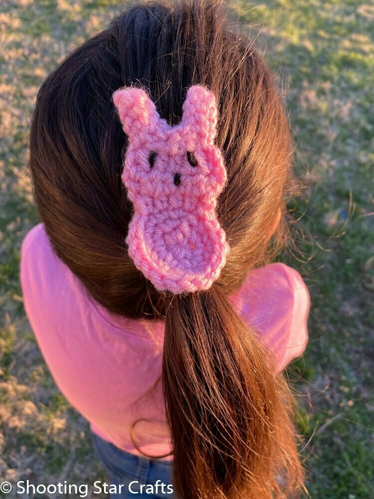 My daughter loved her Shamrock Hair Elastic so much that she has requested one for every holiday. She would really prefer to have a different one for every day of the year, but that will take us some time to finish. For Easter I decided to make her a bunny hair elastic. At first she told me she wanted one with a fluffy white bunny tail. As soon as I finished the pom pom for it, she told me “I think I want one with a face instead.” I put a face on one for her, but since I already had a bunny tail made I decided to make a second hair elastic for her. She was thrilled!