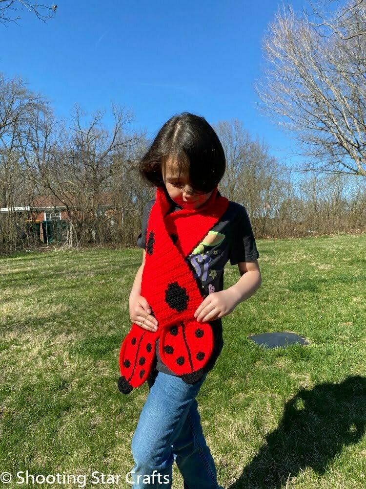 My daughter loves her ladybug hat that I made for her and wears it often. We decided that she needed a ladybug scarf to go with it. She loves the ladybugs at the end of the scarf. The ladybug spots on the main section of the scarf was also requested by her. She was very happy that the scarf I designed turned out just like she had imagined.